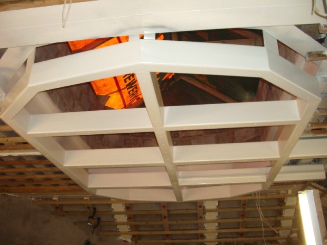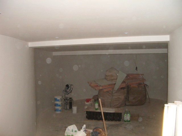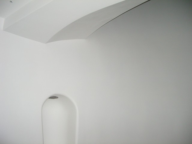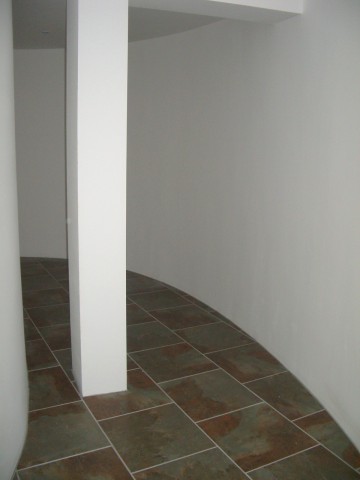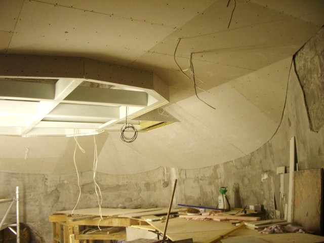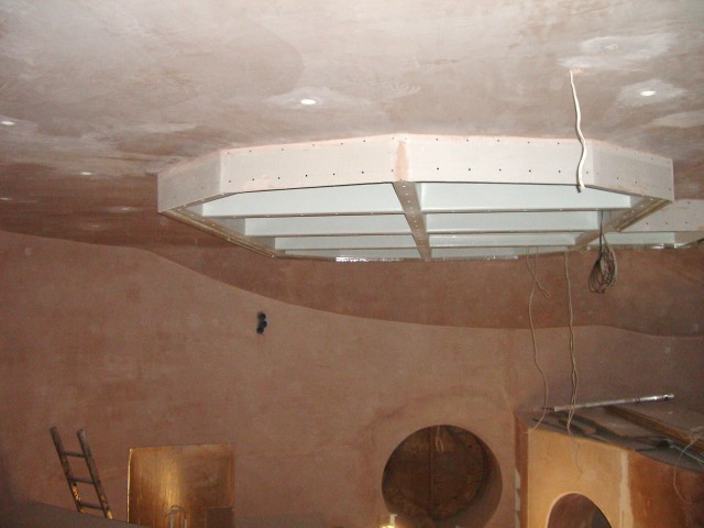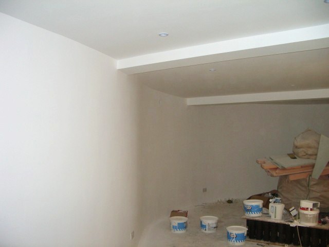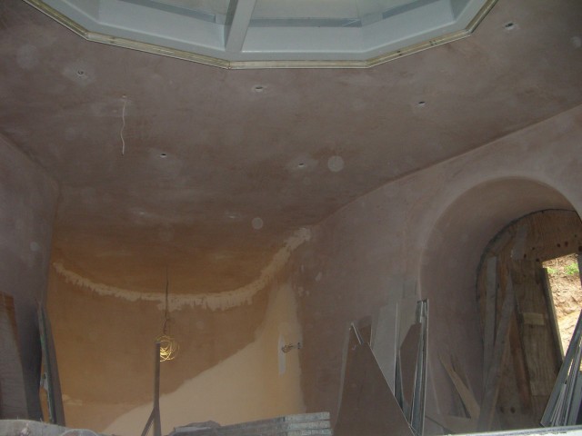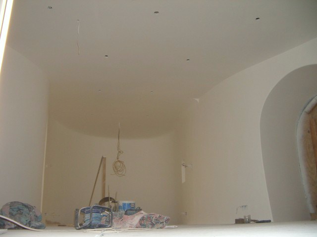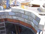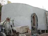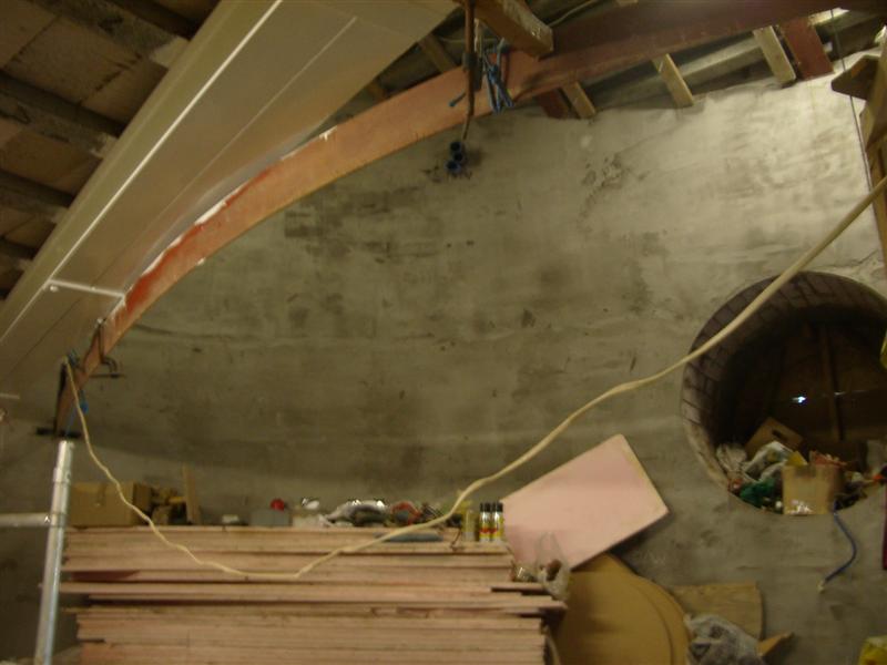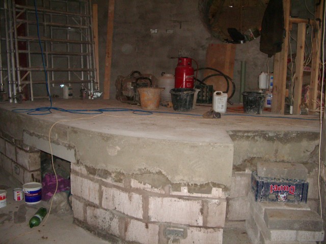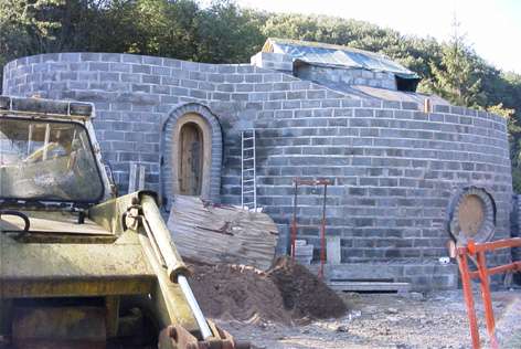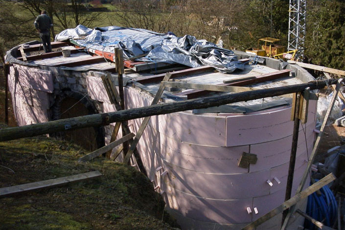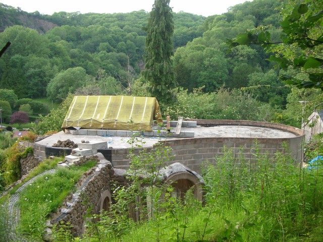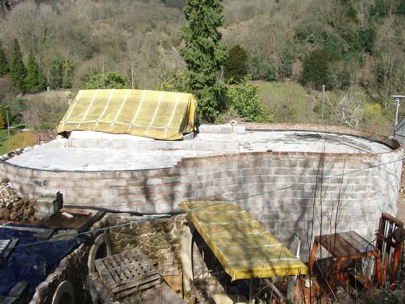 As the walls went up, the mezzanine bedroom floor went in, with similar construction to the ground floor. Now out of the ground, the insulation had to be bolted to the 100mm skin prior to rendering. In keeping with the free form shapes of the building, the doorways are sort of oval arches, narrower at the ground than at shoulder height (there must be a name for this). It is difficult to fit doors to a doorway like this (more correctly, it is difficult to fit a door that opens), and I had in mind a vaguely formed plan to make some tricky hinges so that the doors moved directly forward a short distance before swinging. However, idly flicking through a book about Gaudi's architecture one day I noticed that he used, in similarly shaped doorways, timber infill to allow a straight section between the hinges. So I may well do that. A bodge, but it is only an annexe, after all. The walls went on up, and quite a serious ROOF went on. Designed to be capable of carrying over 1000mm of earth over an unsupported 9m span, it is basically a beefed up version of the internal floors. The reinforced concrete beams sit on the lower flanges of the steel supporting beams, to avoid deep internal intrusions (this caused a lot of grief for the concrete beam manufacturer, who doubted their ability to maintain sufficiently accurate tolerances for beam length. In the event they did an excellent job) Over the beam and blocks is a 300mm layer of foundation blocks (which are good thermal insulators) over which is 100mm of extruded polystyrene. The blocks are mainly there to bring the level up to the top of the steel beams, avoiding high external intrusions (extrusions?). I doubt that many roofs are made from foundation blocks. Over this is 100mm of reinforced concrete, which is tanked with the same torch on membrane. Over that (call that a roof?) is 75mm fibre reinforced screed, covered with drainage sheet, which should keep the screed reasonably dry while also providing a water reservoir for the green roof. A large roof light protrudes through the roof, which will eventually house the observatory (having a triple glazed glass floor to allow light into the rest of the building, but to cut down on convection currents which would upset observations). Outside, part of the building is to be covered with, er, hill, and the part which is exposed is faced with rock saved from the excavations. However, first the whole building was skinned in concrete blocks, to keep the insulation snug, and to avoid worry about the stability of the rock wall. The parts to be faced with rock had a 225mm block wall, sloping 300mm out from top to bottom (although not built in that order), and the rest was protected by a vertical 150mm wall.