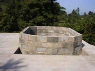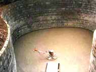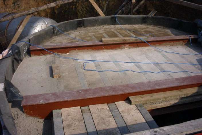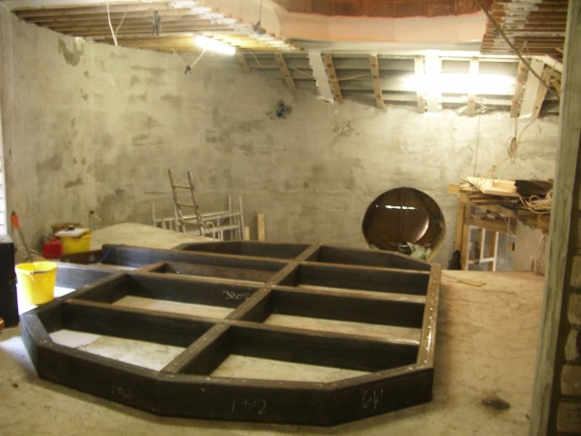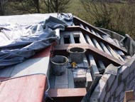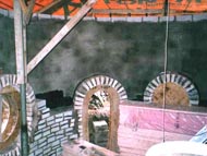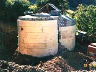The block wall was rendered, and tanked with torch on modified bituminous membrane. The first lift of this, up to ground level, was one of the few jobs contracted out to professionals. It leaked. Inside this was a 440mm wall built from lightweight (29 kg each!) foundation blocks, laid end on 100mm from the tanking, the gap being backfilled with mortar, and the occasional ventilation pipe. At the same time, a spiral staircase was cast into the wall, one step at a time, using a steel mould fabricated for the purpose. At ground floor/cellar ceiling level, a steel supported block and beam floor was installed. Around this time, the weather deteriorated and I decided to build a temporary roof over the annexe area. It seemed like a good idea, but it took a long time to build out of hop poles and lorry curtains (passing aircraft must have puzzled for a year or two as to why there was a large advert for the Aston Brewery high up in the Malvern Hills). A removable section was made to allow building materials to be lowered in. As it turned out, the temporary roof proved very useful, allowing work to continue through some pretty horrible weather. It also confounded the predictions of some sceptics who were convinced it would blow away during gales. Hop wire stays proved, to borrow a phrase, efficacious in every way. It was quite sad when the time came to dismantle it.